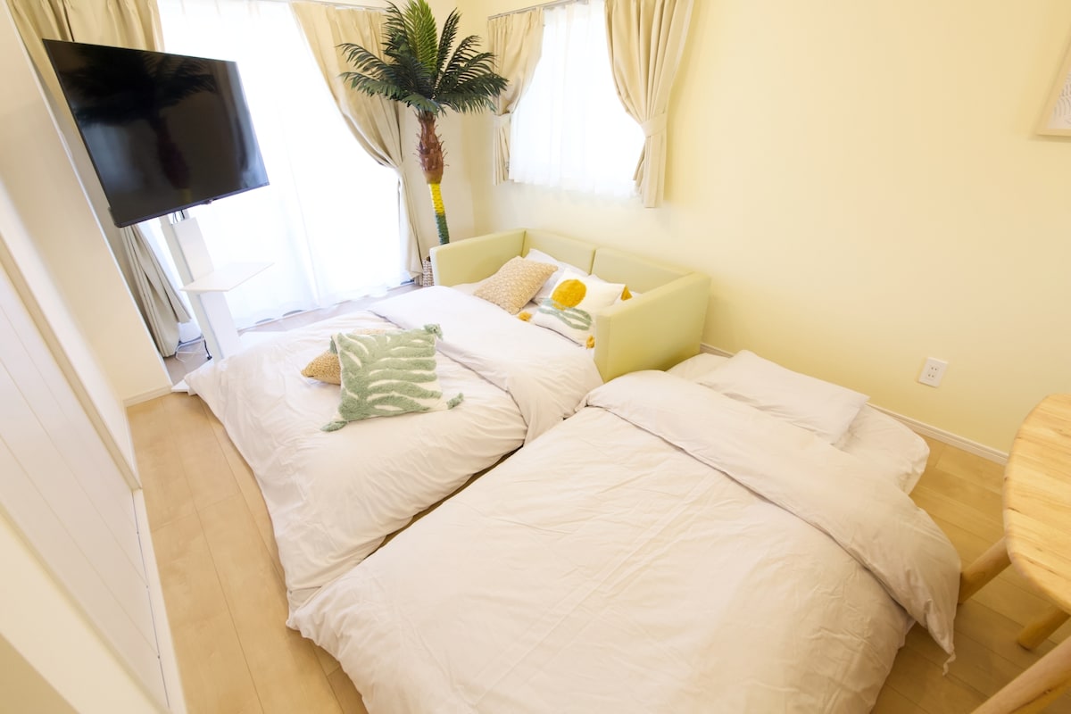 ✴︎ Attention✴︎ A demolition work started in the neighborhood as of late Feb 2026 Noise will be occurred. === This 1LDK apartment is located one block behind Route 58. Ideal for family or small group. 400m from Kencho-mae (Prefectural office) station (6 stations from airport). Basically 2 single futon sets(max 3sets are available). If you wish to share your bedding with your child, she/he is free of charge (if you have 2 such children, please count them as 1 adult and order 1 more bedding).