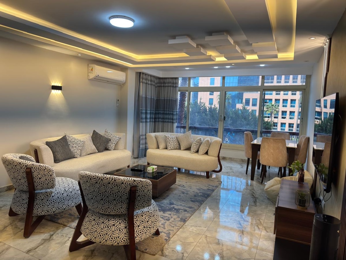 Élvezd a luxusszállást egy két hálószobás, szállodai stílusú lakásban, Nasr City egyik legjobb helyén, közvetlenül a City Stars Mall mellett. A lakás elegáns és modern bútorokkal van berendezve, és a következőket tartalmazza: Teljesen felszerelt konyha mindennel, amire szükséged van (hűtőszekrény, mikrohullámú sütő, vízforraló, légsütő). Vasaló és vasalódeszka, hogy kényelmes és teljes legyen a szálláshely. Tágas és világos társalgó a pihenéshez és kikapcsolódáshoz. Nagy sebességű internet és központi légkondicionálás Az elhelyezkedés nagyon különleges, csak néhány lépésre éttermektől, kávézóktól, bevásárlóközpontoktól, és könnyen megközelíthető a repülőtér Tökéletes családoknak vagy üzletembereknek, akik kényelmet és luxust keresnek