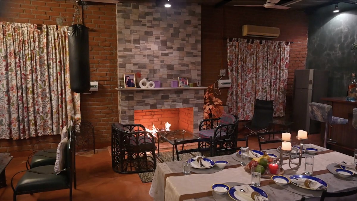 Nestled in Jaipur, this 4-BHK villa, built using rammed earth, combines zero-carbon sustainability with elegant design. It offers unique spaces like an art nook with paintings & instruments, a sunken veranda, & a lush garden with bonfire seating. Enjoy a vibrant gaming zone, & a living lounge with exposed stone & window seating. Experience 5-star service embracing Atithi Devo Bhava.
