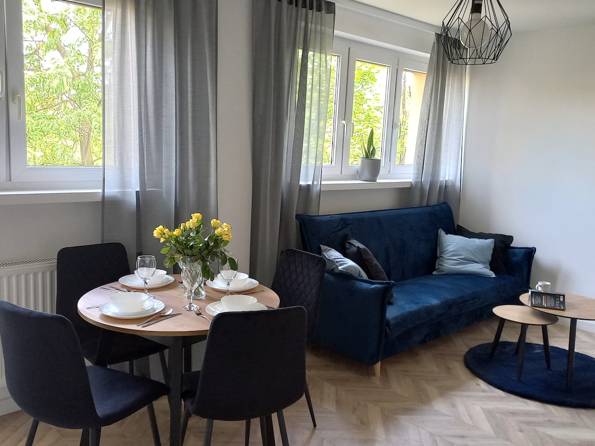 Admire how modern features blend harmoniously into a period apartment. A sunny front room overlooks a leafy neighborhood while houseplants and botanical prints continue the natural motif indoors. A cabinet displays a collection of elegant dinnerware. The apartment is near the city center of Wroclav. It's a 10 minutes by tram or 25 minutes walk to the centre (Arkady)Although a tram stop is close by, this is an incredibly quiet and peaceful place. Some quirky local cafes are just around the corner