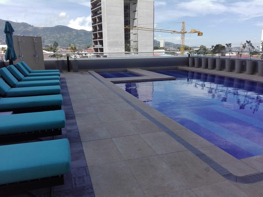 Our Terrace apartment is located in an exotic, Unique, Hip, Cool, and Relaxing High Rise 5 stars Resort Style Condo centrally located in the Gastronomic district of San Jose Costa Rica. the Resort Style Condo has it all! Pool, Gym, Co-working areas, 29th Story Terrace, Private Meeting Rooms, Theater Room, Laundry.