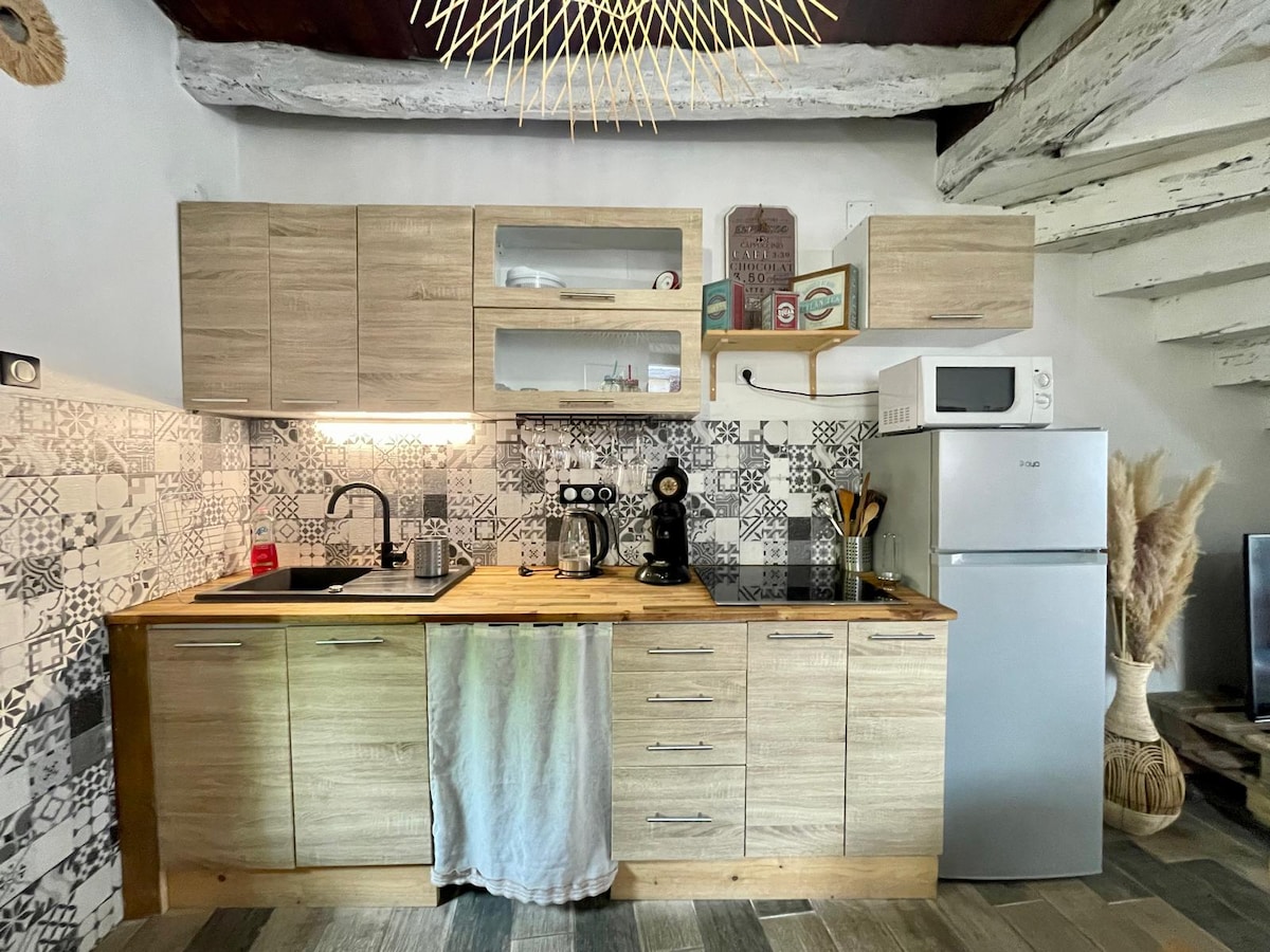 Nyugodt, garantáltan erre a tipikus perigordi kis házra, amely nem elszigetelt A gîte: - földszint: nyitott konyha: hűtőszekrény, tűzhely (indukciós főzőlap), mikrohullámú sütő, kávéfőző, kenyérpirító. nappali átalakítható kanapéval fűtés esetén - padló: hálószoba és fürdőszoba/wc, tetőtér, maró lépcsőkkel megközelíthető gerendák alatt, ezért csökkent mozgásképességű személyek számára nem megfelelő, vasaló és vasalódeszka - kerti bútorok, napozóágyak és napernyő