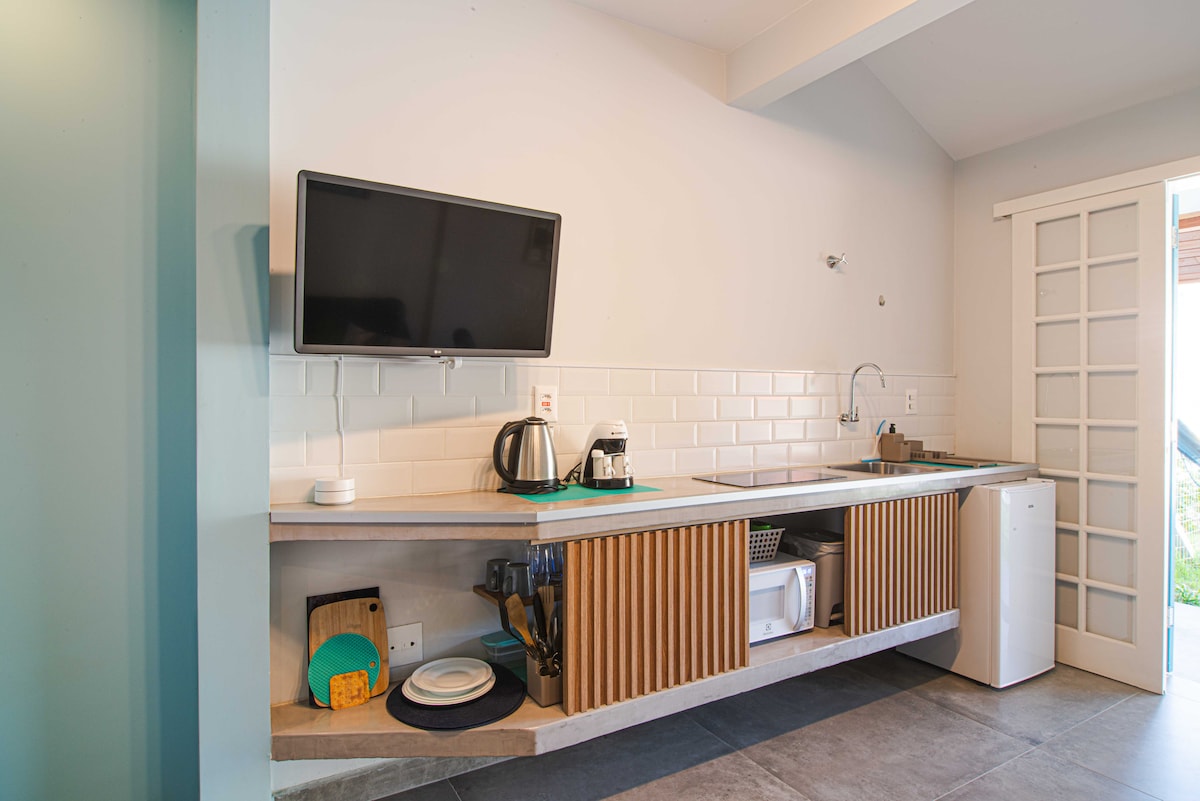O chalé é totalmente equipado para uma estadia confortável e inesquecível: Quarto • Quarto aconchegante com sacada e vista para o pôr do sol Sala • Sofá confortável para relaxar depois da praia • Smart TV • Ar-condicionado Cozinha completa • Utensílios para preparar refeições completas Banheiro • Chuveiro com aquecimento a gás Relaxamento • Banheira de hidromassagem para momentos de descanso a dois À noite, o clima é silencioso com céu estrelado e a brisa suave vinda do mar.