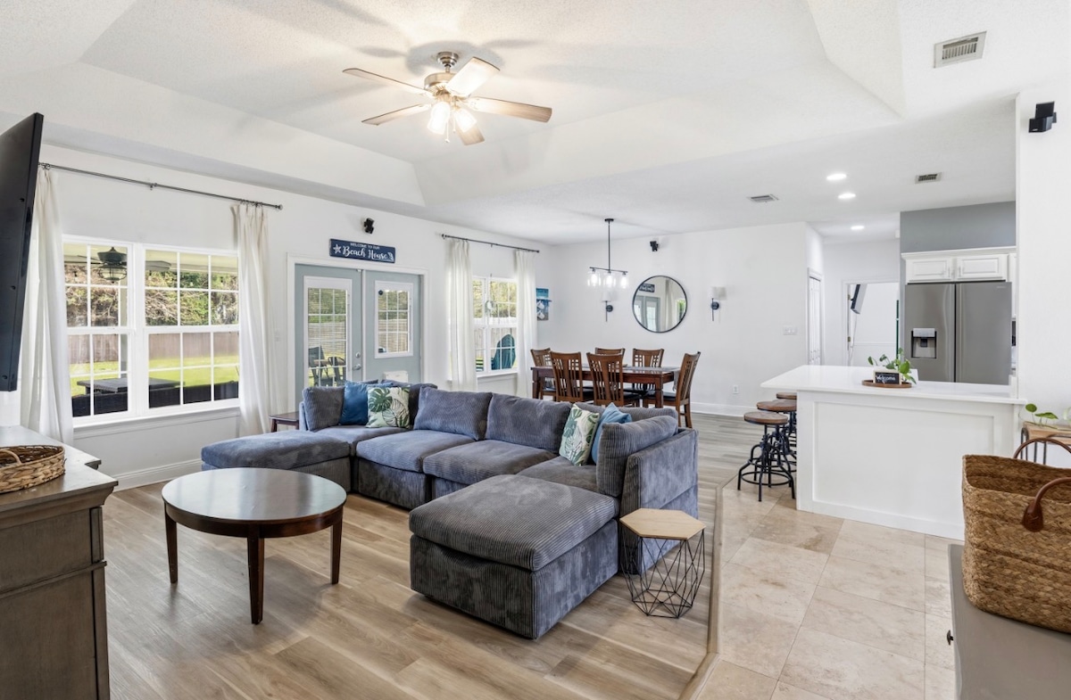 Foglald le az emlékeidet ezen a kényelmes helyen! 10 percre a Navarre Beach-től; ez az egyszintes, 2060 négyzetméteres, modern elrendezés mindenkit biztonságban tart a tiszta hellyel. 6 férőhelyes és 8 férőhelyes a nagyszerű családi vacsorákhoz. A 4 hálószoba és a fürdőszoba egy nagy, boltíves, nyitott konyha/nagy szoba nappalival rendelkezik. Privát erdős, 50 hektáros ingatlan közvetlenül az East Bay Blvd mellett, ahol gyorsan elérheted a vásárlást, a golfot, a sörfőzdéket és a fehér homokot, így ez az otthon a kikapcsolódás központjává válik egy hosszú, kalandos nap után.