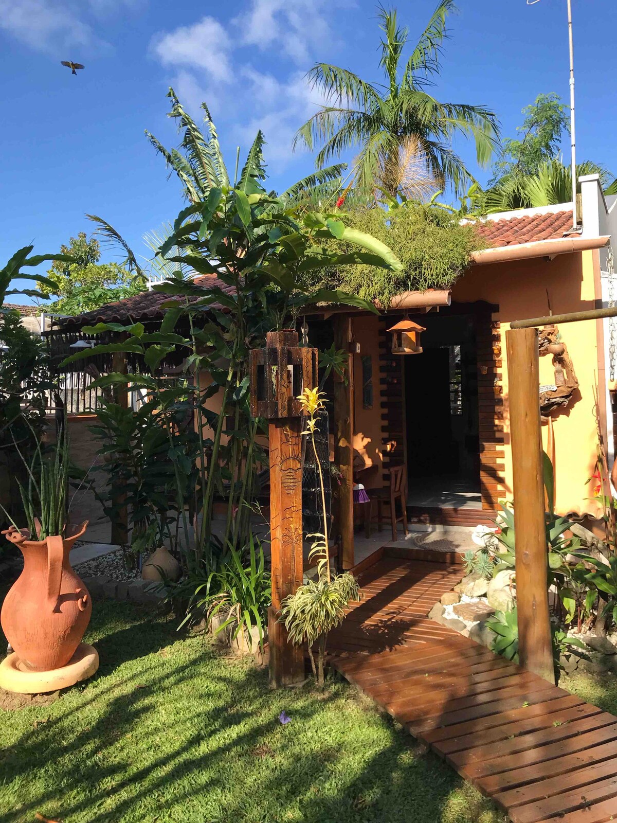 Gyönyörű faház, hangulatos kerttel, gyönyörű késő délutáni kilátással. Ideális családok és barátok számára, hogy élvezzék a beto ösvényparkot, ahol sétálhatnak, és azoknak is, akik szeretik élvezni a strandot. A kunyhó Penha gyönyörű strandjai közelében található, ösvényekkel, vízeséssel, elhagyatott strandokkal, bárokkal és éttermekkel. A ház ugyanazon a telken található, mint a tulajdonos háza. Távolság a strandtól - 700 m Beto carreiro távolsága - 800 m