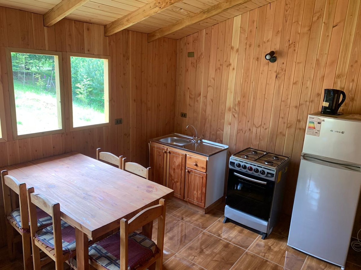 A solo 10 minutos de Huilo Huilo y otros atractivos turísticos. Cabaña para 4 personas full equipado y con conexión a y wifi El comedor cuenta con microondas, licuadora, vajilla completa, utensilios y TV con wifi. Además, quincho y áreas comunes, compartidas con los demás huéspedes. Piscina techada (no temperada) Tinaja y sauna privados a orilla del estero (servicio adicional, reserva con 1 día de anticipación). Incluye sábanas y toallas. Estadía mínima: 2 noches La calefacción es con bosca