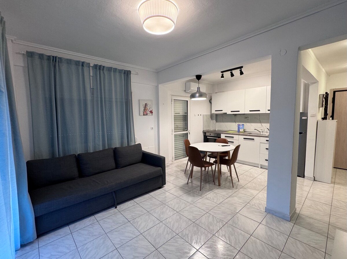 Ez a tengerparti apartman tágas erkéllyel rendelkezik, ahonnan gyönyörű kilátás nyílik a Thermaikos-öbölre és a Thesszalonikire. Tartalmaz egy nagy, hangulatos nappalit egy kanapéval, amely franciaággyá alakítható, valamint egy konyha egy további kanapéval. A kicsi, mégis kényelmes fürdőszobában zuhanyzó és csap található a mindennapi igényekhez. A konyha mini sütővel és ingyenes mosási lehetőségekkel van felszerelve. Ezenkívül korlátlan 300 Mbps sebességű Wi-Fi áll rendelkezésre. A lakást teljesen felújították.