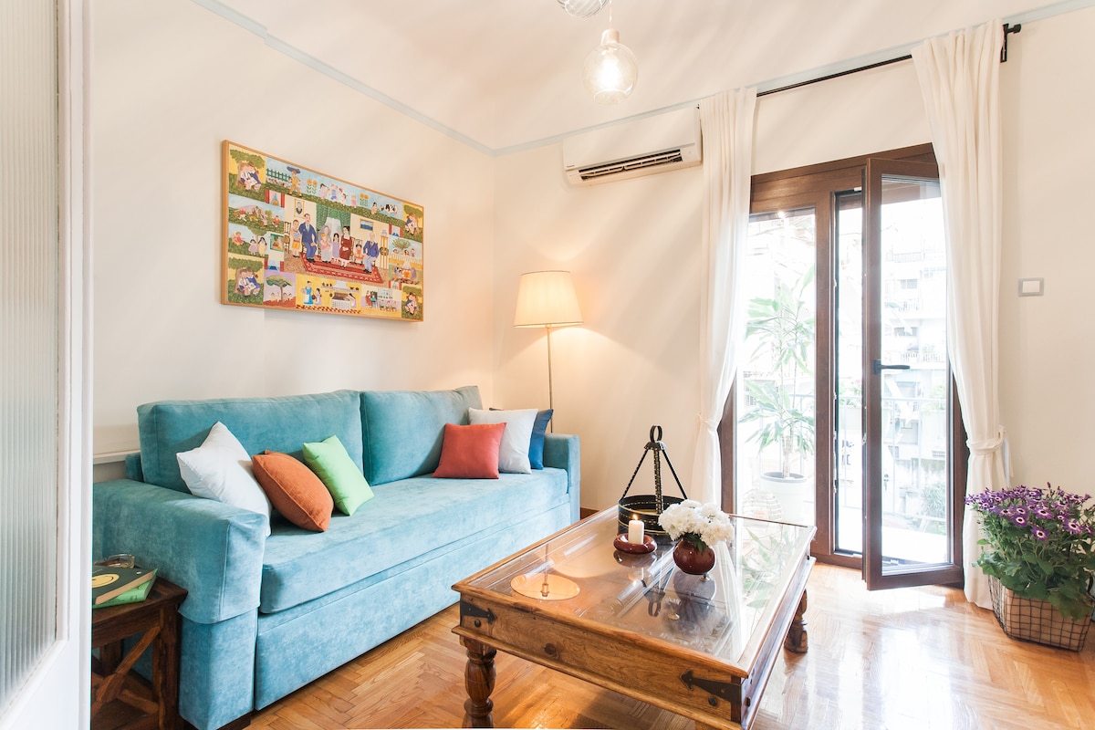 This welcoming, colourful 55 sqm. apartment is in a walking distance from Acropolis and all the archaeological sights. It has direct access to all public transport and is surrounded by pedestrian streets full of local restaurants, cafes and mini markets. It is on the 1st floor, in a safe neighbourhood and is equipped with all the amenities to make your stay pleasant and comfortable (Fast WiFi, netflix, A/C, doubleGlazing equipped kitchen, balcony with a garden view to enjoy your morning coffee)