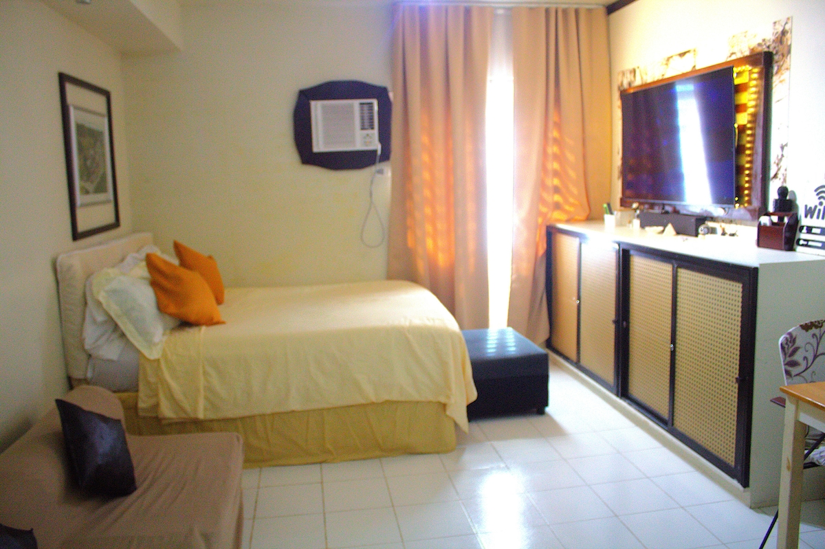 Stúdió típusú társasházi egység Urban Deca Homes Campville-ben, East Service Road, Alabang közelében Kilépés észak felé - 25-45 MB/S WI-FI és 50 hüvelykes Smart TV. A NETFLIX és A YOUTUBE készen áll. NO Cable TV - Queen bed and Sofabed - MELEG/HIDEG zuhanyzó,tiszta törölközők,szappan,sampon,bidével. - Tanulmányi/munkaterület LAN-kábellel, gardróbbal,hajszárítóval, vasalóval, testtükörrel - Étkező és konyha hűtővel,mikrohullámú sütővel,indukciós tűzhellyel, rizsfőzővel,elektromos vízforralóval, ivóvízzel - Légkondicionáló egység. Erkély, ablakok és elektromos ventilátor.