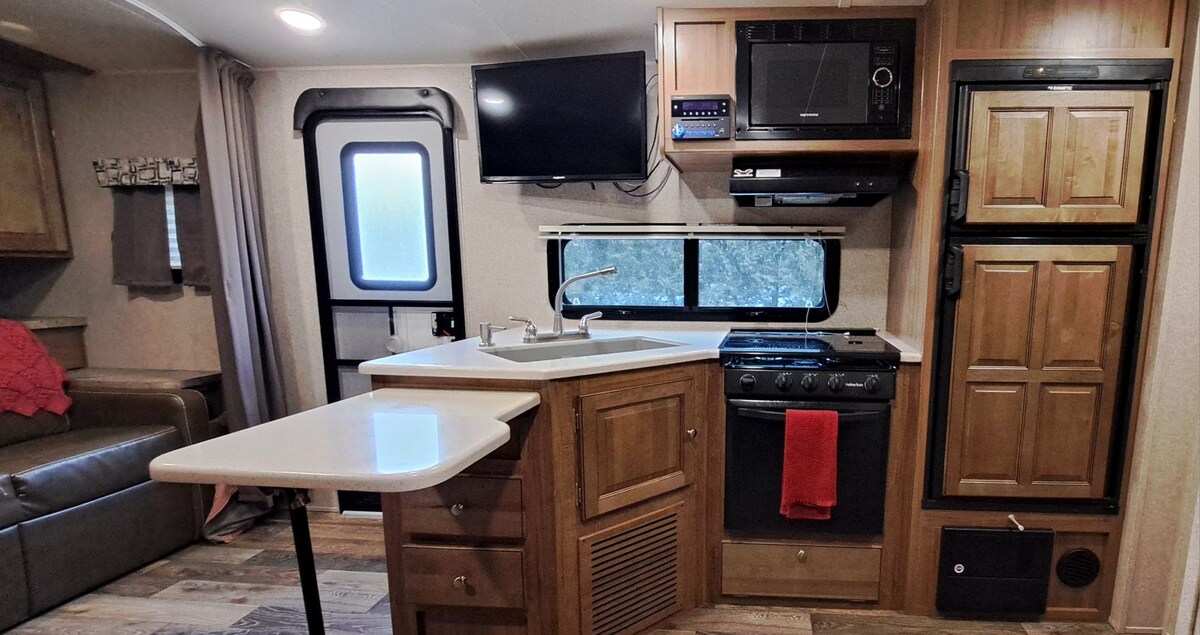 Updated Camper. Enjoy games, movies, kayaks/canoe (included) & swimming during the day & nature walks on 1 of the trails nearby & cook on the grill. 1 car please, park in driveway. In a neighborhood. 2 people-please no other guests. Stovetop, microwave, toaster, coffee maker & grill. Heat/AC. Flushing toilet. We do ask you to limit water use, we provide paper & plastic dinnerware. Many activities nearby oven/firepit No animals (Health concern for cleaner) No smoking. Children 7 & older.