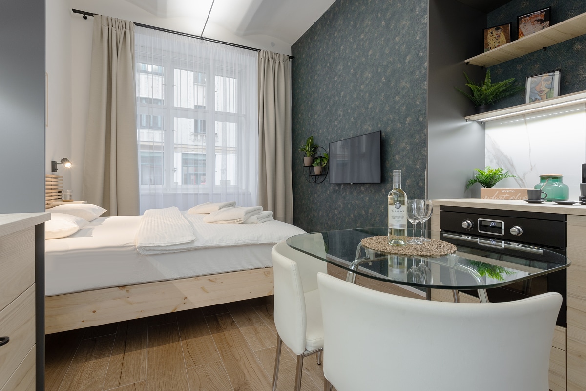 Ez a hangulatos, világos apartman Prága történelmi központjának szívében található. Egy szobából áll, amely egy nagy franciaágyat, tárolóegységeket és egy konyhát hűtőszekrénnyel, vízforralót, evőeszközöket, mosogatógépet és egyéb konyhai eszközöket tartalmaz. Saját fürdőszobával is rendelkezik. A lakást nagyon modern stílusban tervezték, fapadlóval és nagy ablakokkal, redőnyökkel. Minden, amit itt találsz, a kiváló értékelésekkel rendelkező tervezők munkája, akik együttműködtek a hely berendezésével.