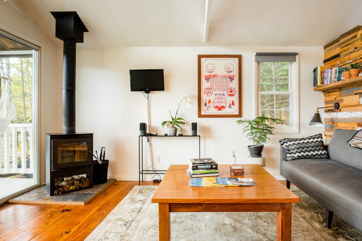 Ölelkezz egy tomboló tűz mellett. Étkezz egy sarokban vagy egy rusztikus fapultnál egy ablaknál. Ennek a furcsa, szeszélyes otthonnak saját terasza van grillezővel, egy kert függőággyal és tűzrakóhellyel. Teljes méretű Murphy-ágy teljes konyhával (a sütő kivételével). A teljes vendégházba be lehet jutni. Egy rövid autóút Woodstock gyönyörű, eklektikus, funky városába. Művészet és kultúra, éttermek, túrázás és kerékpározás a közelben. Elektromos fűtés, mennyezeti ventilátor, álló légkondicionáló és egyszemélyes zuhanyzó.