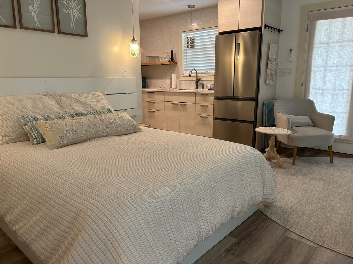 Pihenj és lazíts ebben a nyugodt, stílusos, gyönyörűen berendezett stúdióapartmanban. A teljes konyha teljesen felszerelt, és a közös mosókonyhában extra elektromos készülékek állnak rendelkezésre. A privát fürdőszobában gyönyörű esőzuhanyzó található. Pihenj a hangulatos nappaliban egy kandallóval. Használd ki ingyenes külső Fitness 54 tagságunkat, amely magában foglalja az órákat, az edzőfelszerelést, a szaunát, a jacuzzit, a medencét, az ütőlabdapályát, az uborkagolyót stb.