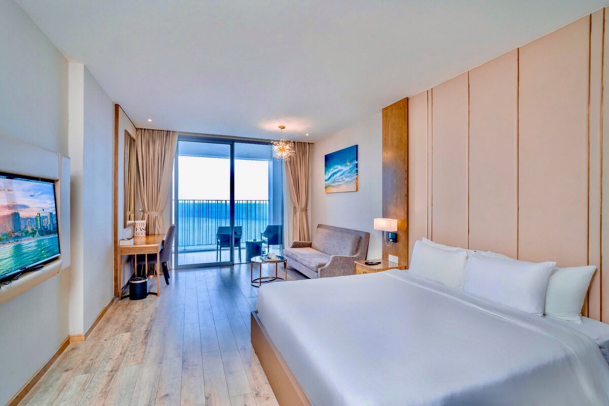 Ez a tágas, teljesen berendezett lakás luxus 5 csillagos színvonalon a magas emeleten, külön hálószobávalés fürdőszobával ( fürdőkád és zuhanyzó, fürdőszobai mérleg, meleg víz), konyha és étkező, saját nappali nagy kanapéval és asztallal, 50hüvelykes TV(> 60 csatorna), wifi, nagy hűtőszekrény, mosógép, 3 légkondicionáló a hálószobában, nappali és konyha. Az óceánra néző nagy erkély (asztallal és székekkel) elsöprő kilátást nyújt a tengerpartra és a Vinpearl-szigetre a tengeren túl.