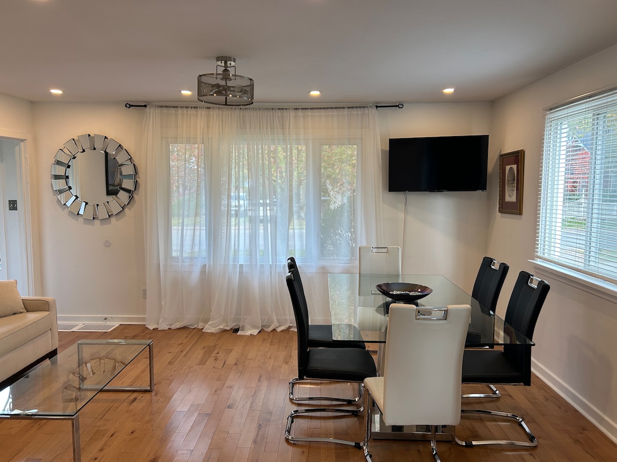 ✹ Vedd fel velünk a kapcsolatot hosszú távú foglalásokra vonatkozó kedvezményekért✹ Lépj be ebbe a stílusos, 2100 négyzetméteres St. Catharines-i otthonba, és élvezd a modern dekoráció és a minimalista dizájn tökéletes keverékét. Az 5 tágas hálószobával, egy melléképületben található lakrésszel, egy fő konyhával, egy pezsgőfürdővel és szabadtéri szaunával felszerelt hátsó udvarral ideális családok vagy nagy baráti társaságok számára. Fedezd fel a felejthetetlen Niagara-vízesést, vagy járd be a helyi borászatokat. Lakeside Park körhinta – 6 perc Belváros – 6 perc Niagara-vízesés – 15 perc