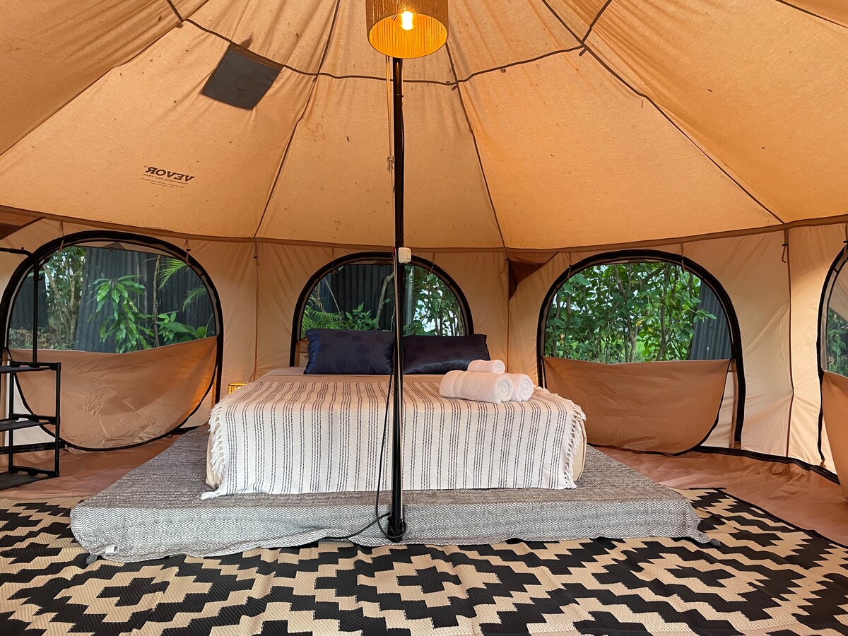 For those who wish to reconnect with simplicity, our glamping tents offer a peaceful and authentic experience immersed in nature. Naturally ventilated and surrounded by trees, these cozy spaces invite you to slow down, breathe deeply, and embrace the raw beauty of the landscape. Each one features: • 1 King bed or Twin beds • Shared bathroom with hot water • Biodegradable organic amenities (shampoo, conditioner, shower gel & body lotion) • Wi-Fi connection