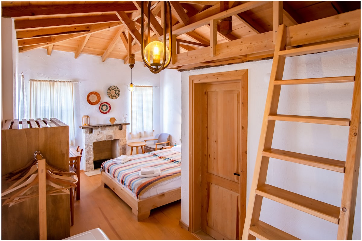 Sterna studio, located right below the medieval castle of Emporeios, is a traditional two-storey turret of the mid 17th Century. It collapsed, along with the rest castle after the devastating earthquake of 1933. Its restoration was completed in 2018 designed by Greg Haji Joannides and restored by architect Giorgos Tsironis. Restoring the authentic architecture of the building was achieved thanks to following the traditional building manner and using the genuine building materials.