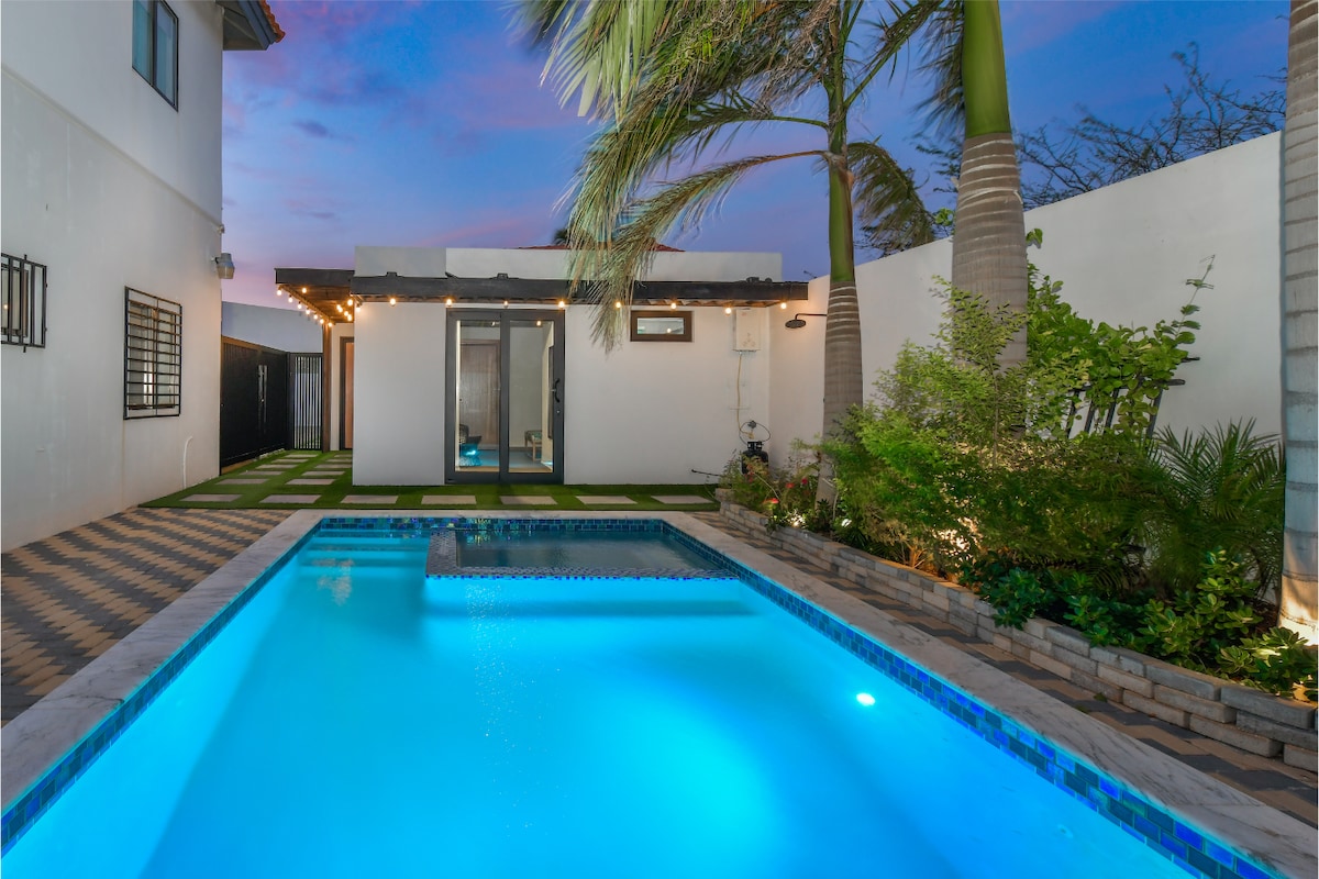 Azoktól, akik a Casa Carmelát hozták el neked. Egy Arubán található szállás, amely a felső 1%-ba tartozik, most bemutatja ezt az új, stílusos szállást Palm Beachen! Élvezd a boltíves mennyezetet, a modern konyhát és a hangulatos függőszékeket. Lépj ki a saját teraszodra, ahol merülőmedence/jacuzzi, bárpult és trópusi hangulat vár – tökéletes a kikapcsolódáshoz a strandolás után. Kényelem és szigetvarázs egy kiruccanásban! Lépések a Palm Beach üzletekhez, bárokhoz, éttermekhez, kaszinókhoz és még sok máshoz. Érkezés napján mindent kitakarítunk, a házat, a kertet és a medencét is.