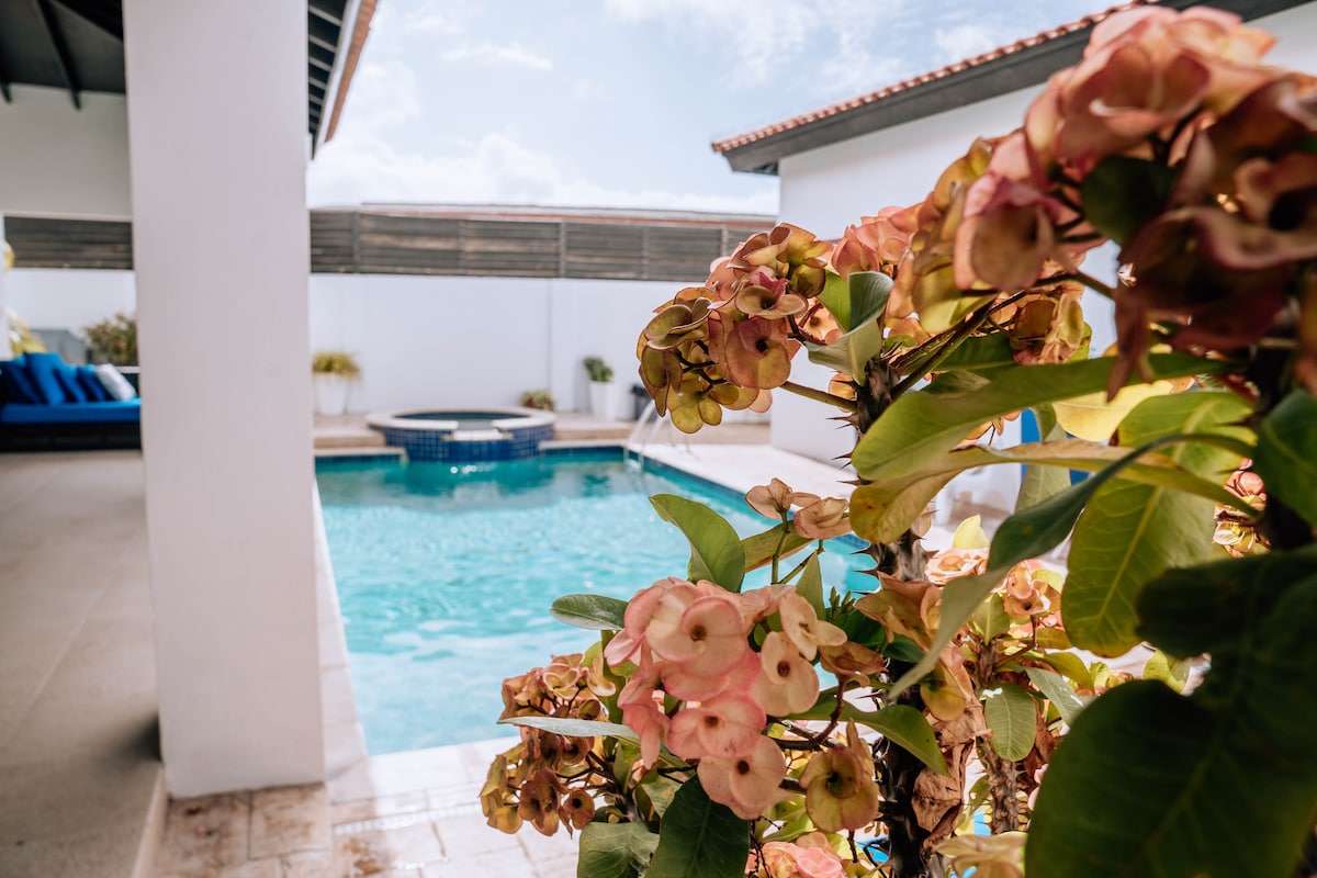 Cute townhouse perfect for a relaxing time, overlooking Hooiberg. Enjoy a beautiful tropical garden with a backyard and pool, ideal for a nice breakfast or coffee. Listen to birdsongs and feel the tropical breeze in the front garden, backyard, or by the pool. Conveniently located a 5-minute car ride from the airport, with the bus stop just a 10 to 15-minute walk away. Surfside Beach and local bars are within a 20 to 30-minute walk, and Oranjestad is a 15-minute drive