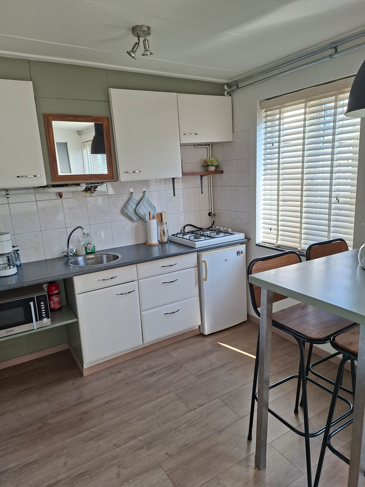 A nyári ház egy kis, kényelmes és tiszta hely közvetlenül a strand, körút, éttermek és üzletek közelében. Van egy új konyha, minden új és szükséges felszereléssel. Van egy kombi sütő/mikrohullámú sütő, hűtőszekrény, indukciós főzőlap és mosógép. A televízió rendelkezik az összes holland és néhány nemzetközi csatornával. Az első emeleten található egy franciaágy (160cmx200cm), fürdőszoba, WC, szekrény és légkondicionáló.