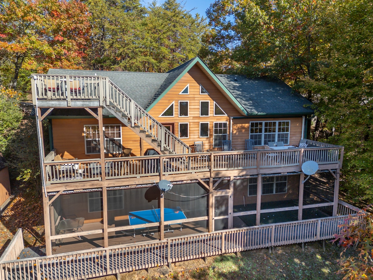 Lélegzetelállító kilátás vár rád a Sequoyah Sunsetben! Tágas, 3 emeletes víkendház, 15 fő befogadására, 4 hálószobával, 3,5 fürdőszobával, teljesen felszerelt konyhával, gáztűzhellyel, játékteremmel, árnyékolt verandával és kandallóval. Élvezd a lenyűgöző kilátást a hegyekre a tágas teraszról. Pihenj és szerezz emlékeket a családdal és a barátokkal a Smoky Mountains területén! *Négykerék-meghajtású jármű szükséges a víkendház eléréséhez. Nincs négykerekű/ATV a környéken.