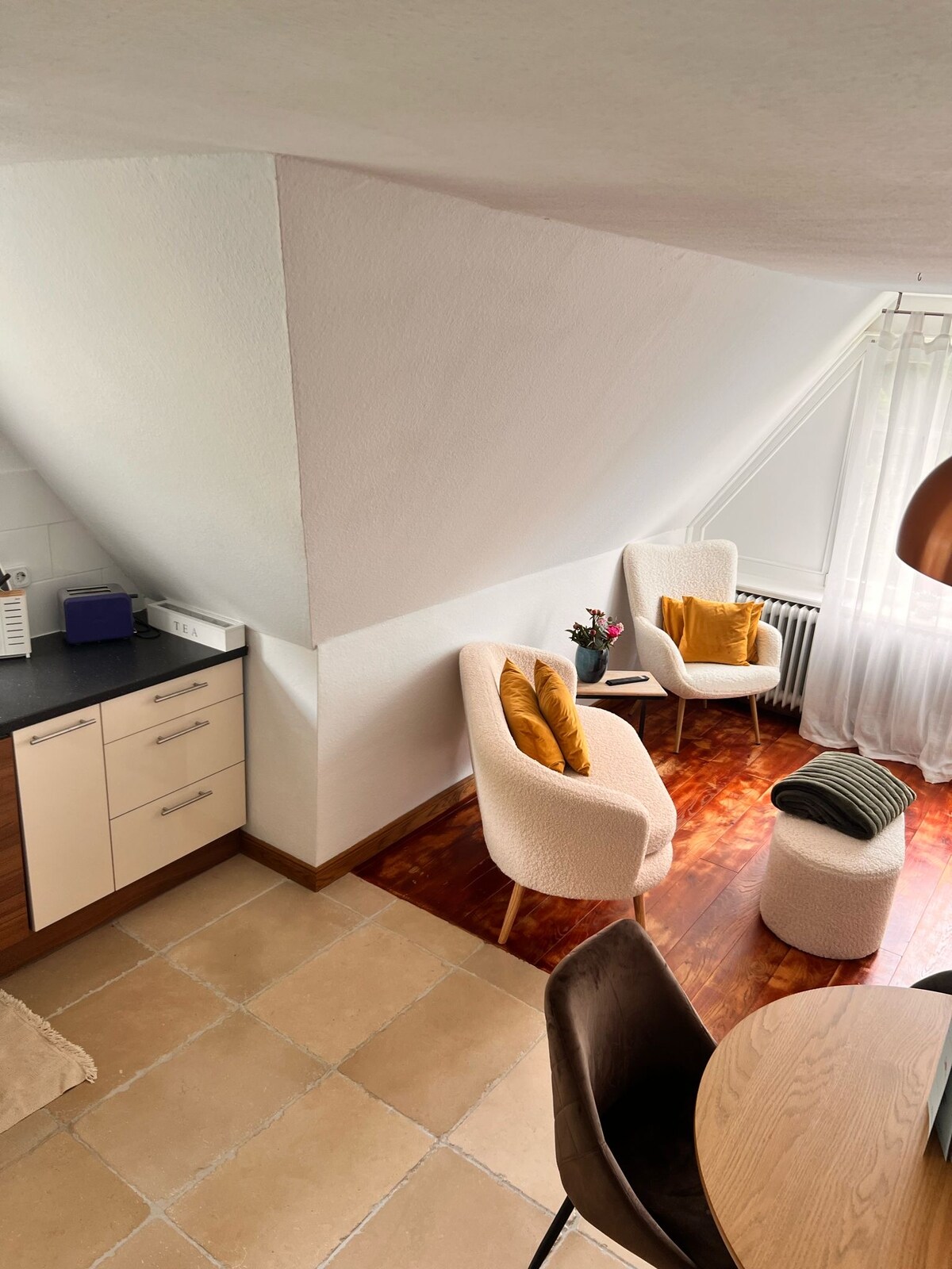 A világos tetőtéri apartman 20 négyzetméterén wellness oázist hoztak létre, amelyben legfeljebb 2 ember hagyhatja hátra a mindennapi életet. A 2 égős indukciós főzőlaptól az elszívóval és mikrohullámú sütővel a kávéfőzőig, a vízforralótól a kenyérpirítóig minden rendelkezésre áll, hogy reggelit, ebédet vagy vacsorát szolgáljon fel a nappali/hálószoba étkezőjében. Élvezze az időt reggel a tágas fürdőben zuhanyzóval, WC-vel és hajszárítóval. A lakás nemes tömörfa parkettával.