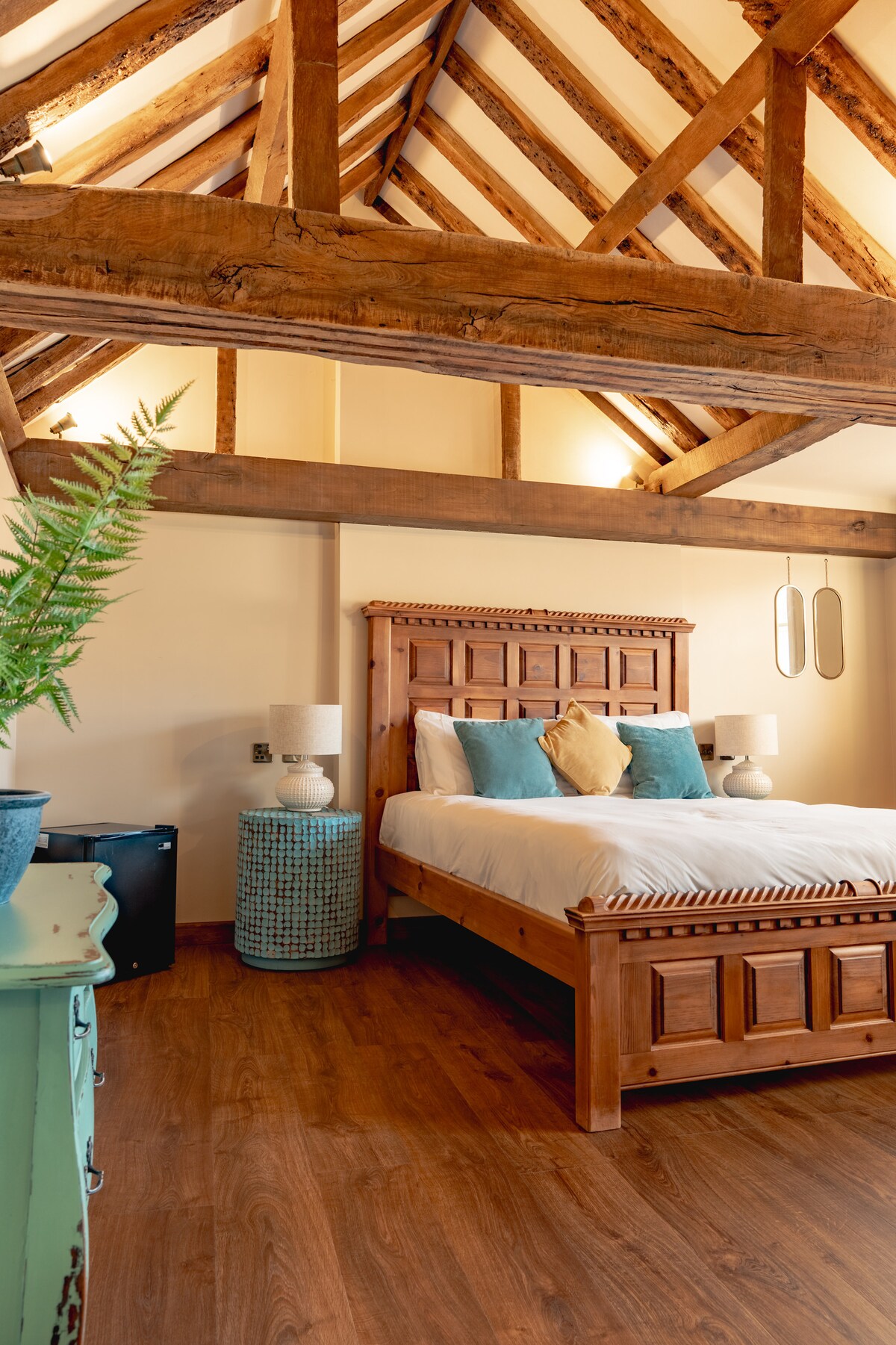 Paddington is one of the largest bedrooms within the complex and comes complete with an adjoining twin bedroom (with full size twin beds). Located on the first floor and boasting a stunning Superking bed with a magnificent bespoke, walnut headboard that was locally sourced from Norfolk Reclaim. Off the beautiful bedroom, you will find the shower en suite, decorated with an elegant blue hexagonal tile and a vibrant blue sink too! This bedroom is perfect for couples, friends or small families!!