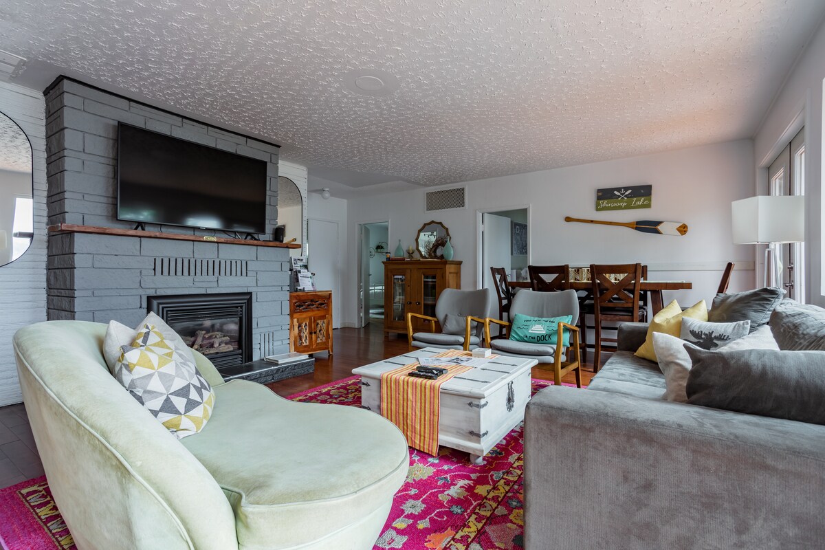 **Private lakefront property **Salt Water Hot Tub **Stunning views **Relaxing atmosphere with gas fireplace **3-bedroom 2 bathroom! ** Large living room ** Fire pit with complimentary firewood when fires are permitted ** Washer/Dryer ** Complimentary kayaks, paddleboard, canoe, pedalboard in summer ** Walking distance to seasonal marina restaurants, grocery, deli, liquor store