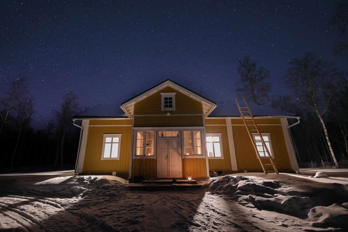 Ritka találmány – egy hagyományos finn rönkház, amelyet a 20. század eleji bájjal építettek újjá. Kapcsolódj ki, és élvezd a csendet egy nagy tengerparti ingatlanban, amelyet gyönyörű természet vesz körül. Pihenj a fatüzelésű szaunában, amely hordozható zuhanyzóval is rendelkezik, és főzz friss ételeket a modern konyhában. Vezetett túrák egész évben. 2 óra Rovaniemiig, 1 óra Ouluba. Transzfer elérhető. Tartalmazza: teljesen felszerelt konyha, szauna, Wi-Fi, parkolás. Extra: ágynemű és törölköző 15 €/fő, transzfer. Tevékenységek, bérelhető felszerelés és téli ruházat.