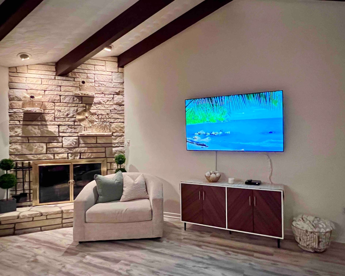 A nappaliban egy 65hüvelykes intelligens TV található,falra szerelve, amely alatt egy LCD kandalló található, amely térhatású hangzással rendelkezik - Minden TV-vel rendelkezik Netflix-szel. A bárszobában van egy kis hűtőszekrény, a biliárdasztal és a darts deszka. A privát lanai fűtött medencével és egy propán tűzrakóhellyel rendelkezik. Élvezd a Sonos hangot 55hüvelykes intelligens TV-vel a Master hálószobában, a második hálószobában pedig TV is található. A bárszobában sonos,valamint a lanai.30 percre több strandtól. A garázs nem lesz elérhető. Egy csendes Cul de Sacban található