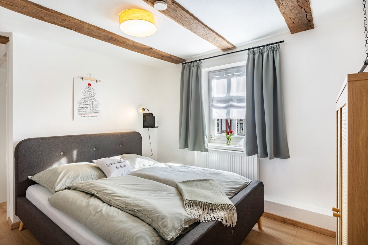 Our historic half-timbered double room offers cozy comfort. The bed has 2 comfortable mattresses on which fresh bed linen ensures a restful sleep. The bathroom is equipped with a window and offers cosmetics, a hairdryer and towels for a pleasant stay. The house is mentioned in the Ziegenhain town records as early as 1572. It has always served as a hostel for traveling merchants on the old trade routes "Durch die langen Hessen" and the "Niederrheinischen Straßen".