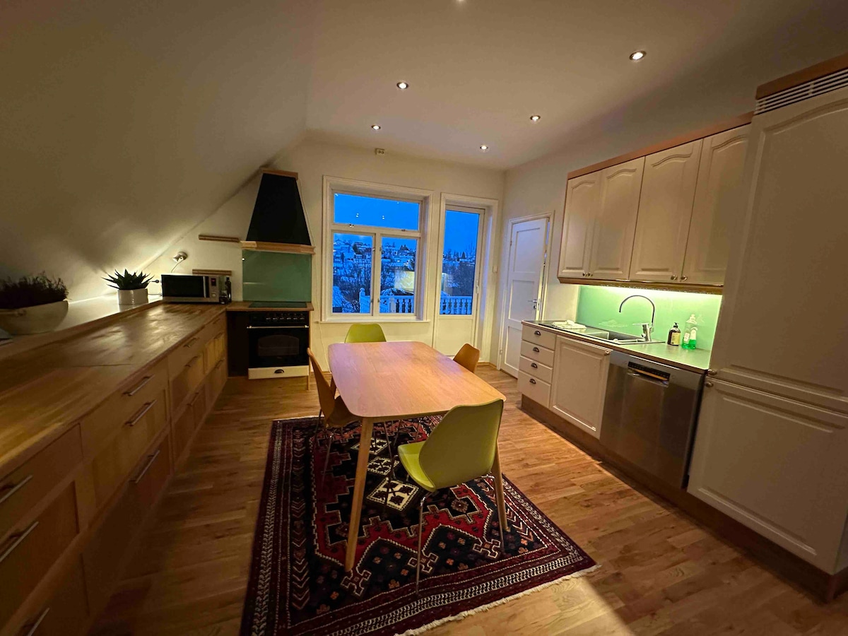 A 360° -os kilátás két erkélyről lélegzetelállító kilátást nyújt a városra, a hegyekre és az északi fényekre. Az apartman 90 m2-es tágas, egy történelmi villa második emeletén. Ingyenes parkolás az ingatlanon.