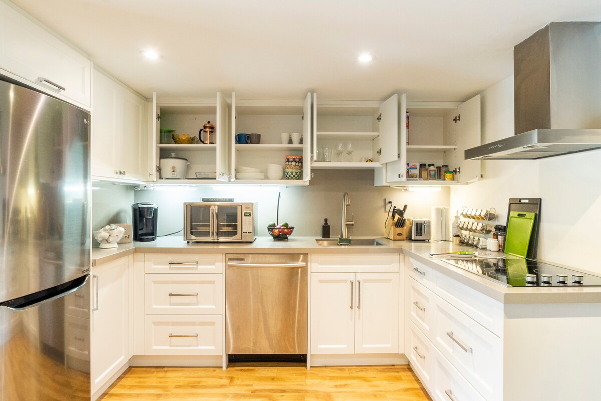 Private Suite Separate Entrance. Large Loungy Private 2 bedrooms, living room, kitchen with hot plate fridge, dining area, bathroom, laundry room, EXCLUSIVE FOR GUESTS ONLY NO SHARED SPACES. A newly renovated and beautiful space. Luxurious linens and extra soft towels, dining and living room are open concept, and are available exclusively for guests - no shared spaces. Coffee - Tea bar area, books, magazines & board games. Full size washer & dryer. Free Private Parking in driveway. EV charger