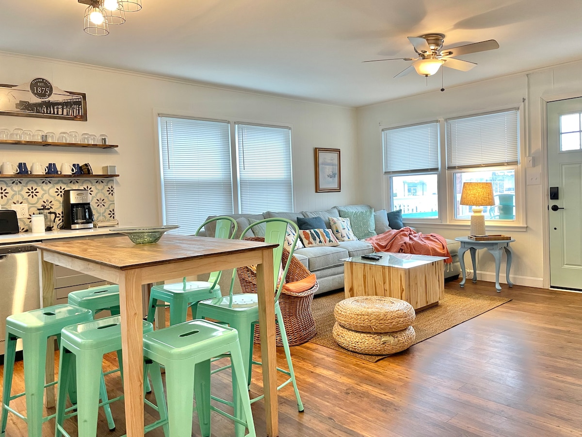 Ilyen vízpartot még biztosan nem láttál. Üdvözöllek az Edgewater Escape-ben, egy luxus öbölparti loftlakásban, amely teljesen az öböl fölé nyúlik a 7. utcában, Ocean City belvárosában. Ülj le az öböl előtti verandára, vagy lazulj el bent, és nézd meg a hajókat, delfineket, madarakat és néha még fókákat is, amelyek a veranda lábain belül úszkálnak. A loftban tágas, king méretű ágy van, és a földszinti kanapé kihúzható, így kényelmes queen méretű ággá alakítható. Nemrég felújítottuk, és teljesen felszerelt a nagy utazáshoz vagy a csendes otthonhoz :)