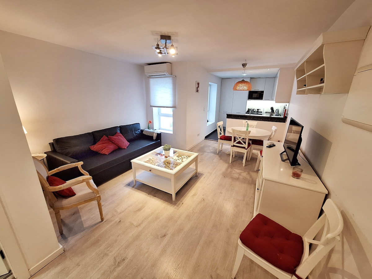 This is a fully renovated three bedroom apartment with a large living and dining room as well as a separate TV space (100's of channels). It is furnished with high end furniture and design elements. The kitchen is fully equipped with modern high quality appliances. It has two full bathrooms with two showers and a large bath tub and a guest toilet. It also has a sunny balcony where a pleasant morning coffee or breakfast can be had. It is on the 5th floor of a building equipped with two elevators