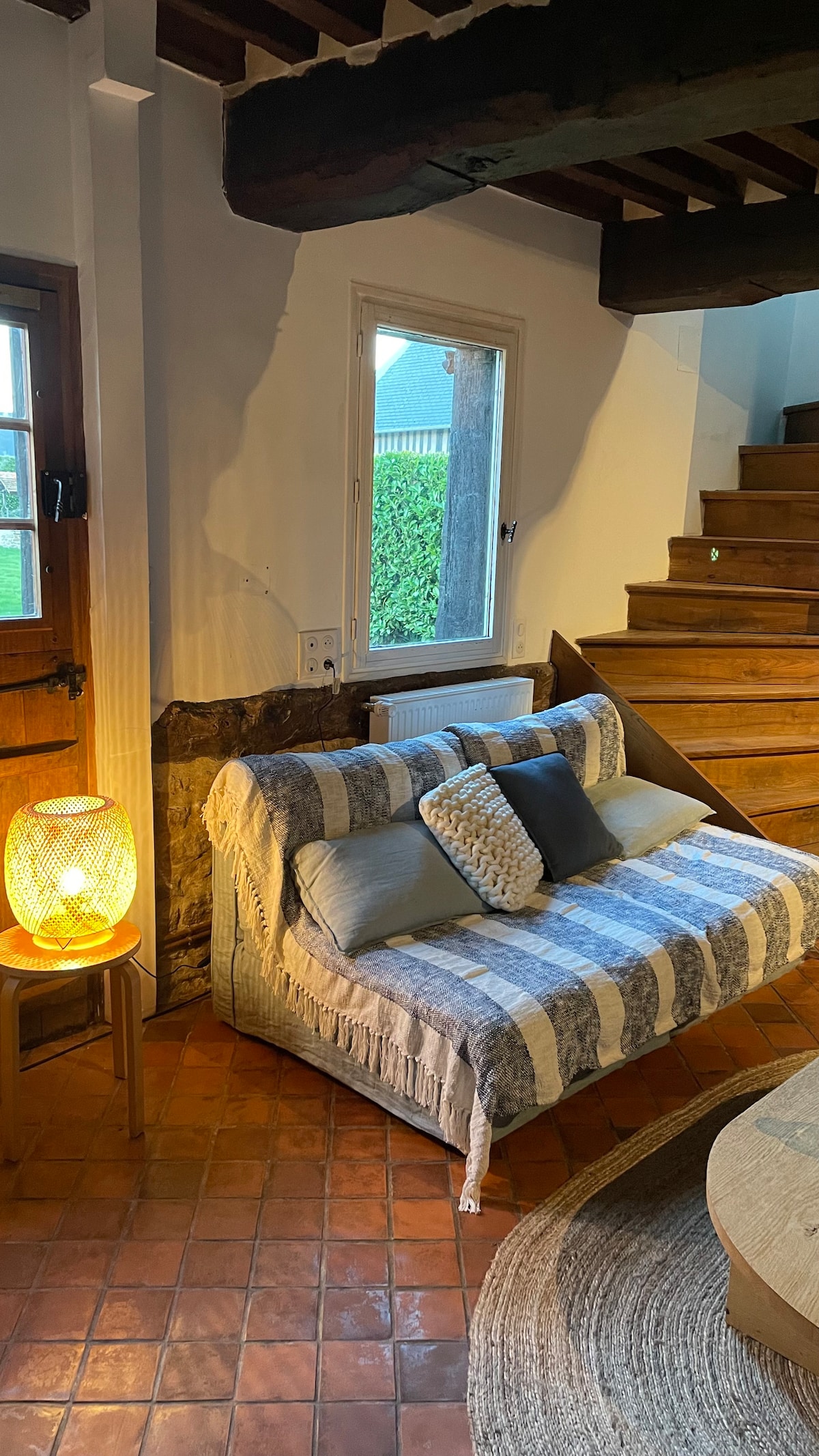 Adorable maison de campagne longeant une rivière organisée comme un loft. Un grand espace de vie, surplombé par deux chambres. La maison bénéficie d’une belle salle de bain. Bcp de charme pour une maison entièrement refaite bénéficiant de tout le confort moderne. 20’ de Cabourg et 45 de Omaha beach La maison se trouve en face de celle des propriétaires dans un jardin paysagé de 5000m2 partagé Les chiens sont les seuls animaux acceptés. Jacuzzi extérieur utilisable de mai à septembre.
