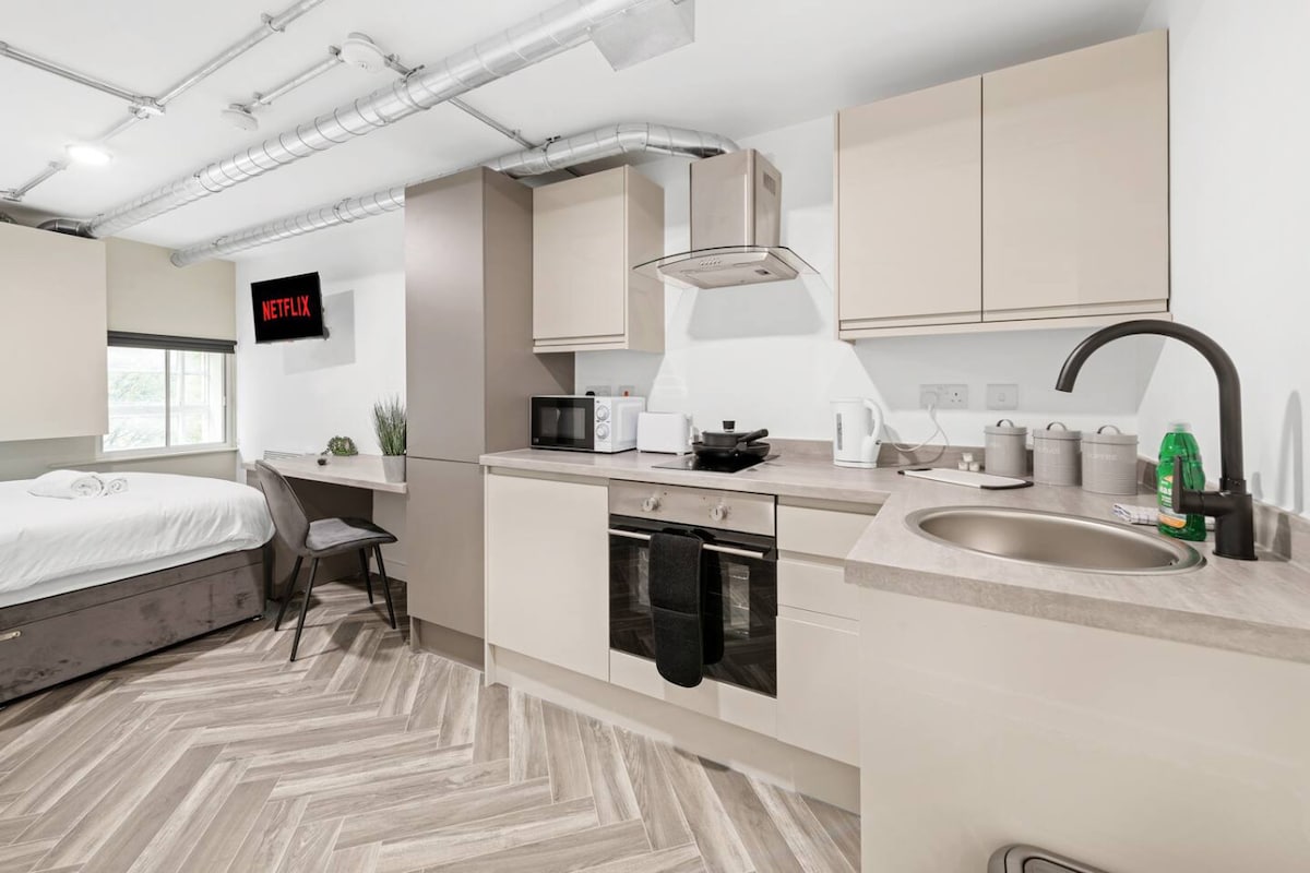 Modern stúdió egy gyönyörű, meghirdetett épületben Nottingham City szívében, 100 méterre a Victoria Centre-től, 200 méterre a Market Square-től. Villamos-, busz-, vonat- és európai autóparkoló a közelben. Felszereltsége a magas igényű konyha, például az AEG főzőlap, a mosógép / szárítógép, a hűtőszekrény hűtővel és a grillező mikrohullámú sütővel. Van benne egy kétszemélyes ágy, egy kis kanapé, 4K Smart Samsung 40"-os tévé elforgatva, gyors internet, bárasztal bőrszékekkel. A stúdió az épület hátsó részének negyedik emeletén található.