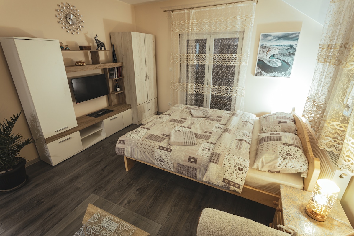Dőlj hátra, és lazíts ezen a nyugodt, stílusos helyen. 25 négyzetméteres stúdióapartman. Legfeljebb 4 személy számára alkalmas (franciaágy és kanapéágy). Minden szükséges elemmel fel van szerelve a rövid és hosszú távú foglalásokhoz. Öltözést, törölközőket és alapvető piperecikkeket biztosítunk. Ingyenes wifi, légkondicionálás és nyilvános parkolás az épület előtt.