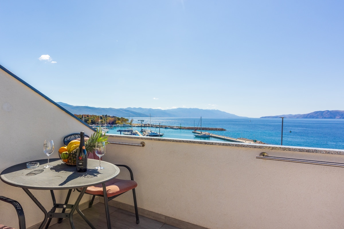 A kikötőre nyíló tengerre nyíló kilátás arra invitál, hogy napjaidat és estéidet az erkélyen töltsd - kilátással a végtelenített medence és az Adriai-tenger csillogó vizére. Legyen szó akár egy pohár borról vagy egy kóláról, egy Uno-meccsről vagy a legújabb regényről, azonnal érezni fogod, hogy nyaralsz. És ha van kedved lemenni a strandra: mindössze tíz perc sétára van a Novi Vinodolski Riviérától. By the way: Novi Vinodolski means „New Wine Valley” - just ask our award-winning winemaker