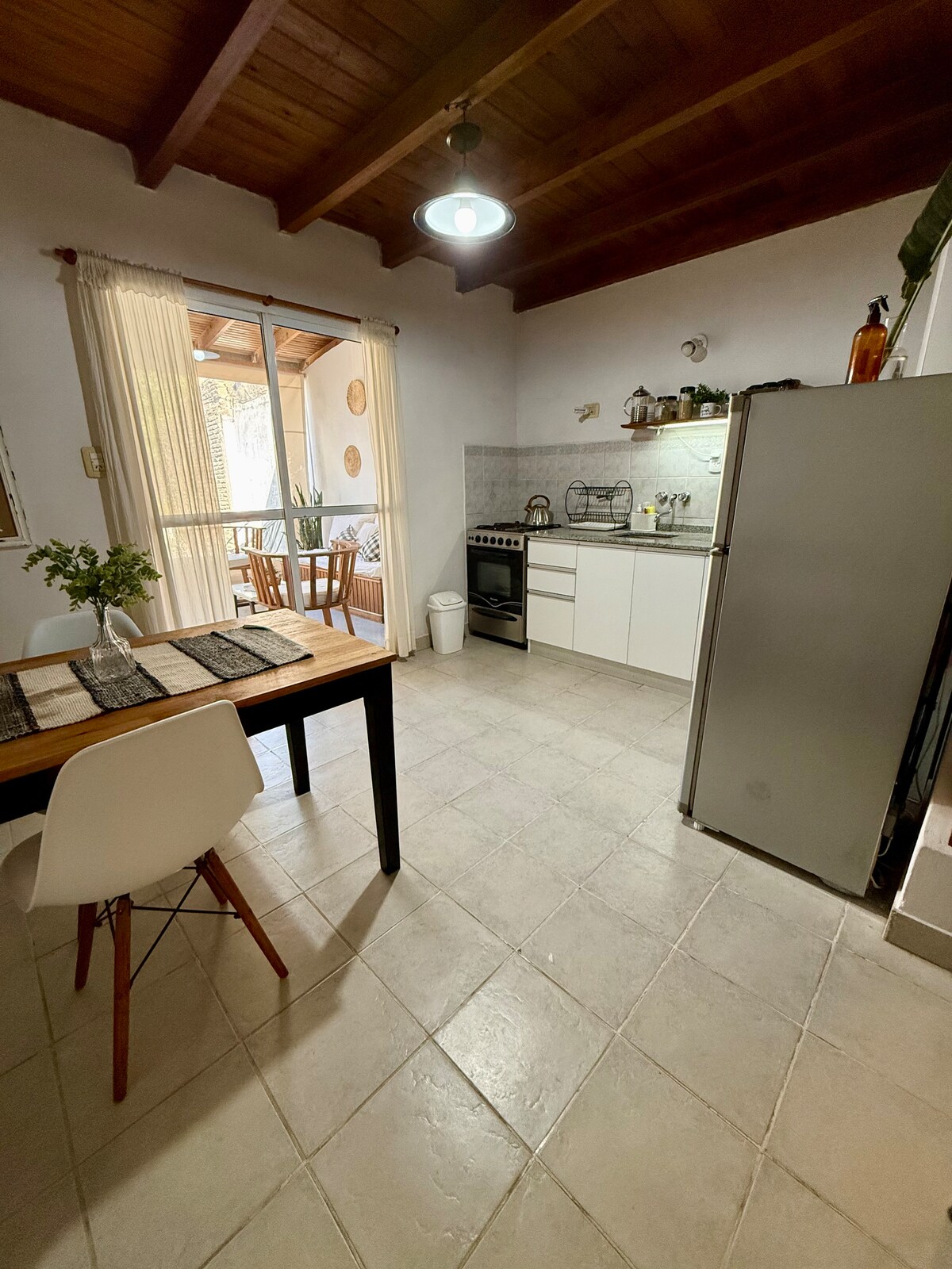 Departamento de 2 plantas independiente y con mucha luz, al fondo de mi casa. Separados por un jardín grande. Es muy cálida con gran jardín. Parrillero grande sobre deck de lapacho. Baño completo. 2 dormitorios. Living comedor. Tiene cocina equipada, pasaplatos hacia el parrillero desde la cocina. Tiene lavaropas, termofon grande y heladera con freezer. Cerca de los accesos a termas y al centro. Lugar de comidas y shopping.