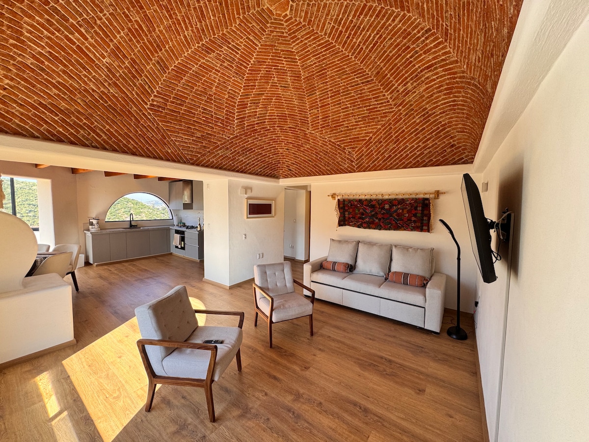110 m2-La cúpula de ladrillo rojo de la estancia principal le da a este apartamento una sensación de espacio y lujo únicos. En la recámara principal encontrarás una cama queen size justo debajo de otra cúpula de ladrillo rojo realizada por los artesanos guanajuatenses herederos de una tradicion centenaria. La cocina con cubiertas de granito. Todos los gabinetes y cajones tienen mecanismos importados. Dos baños completos. Uno de ellos con calentador solar. La decoración realmente mexicana.