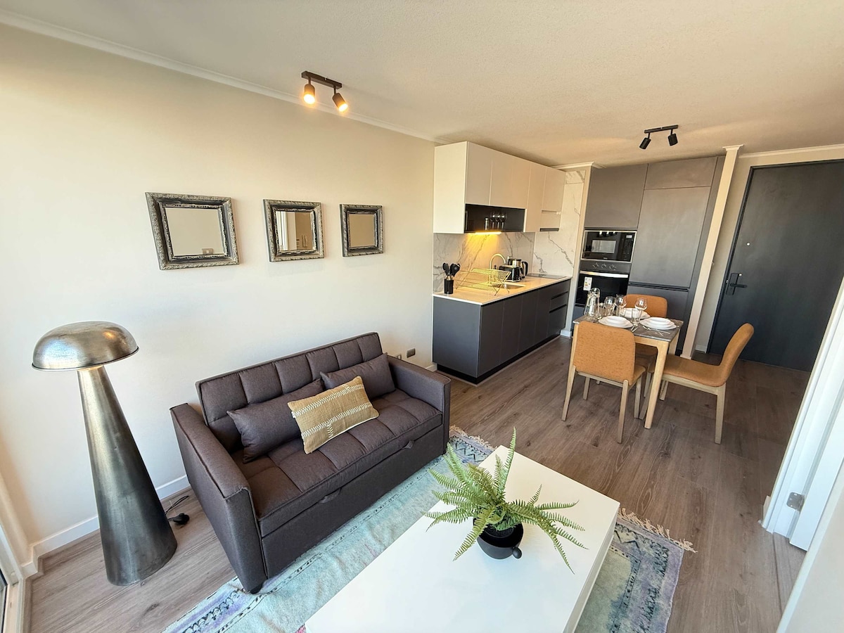 Kifinomult 1D/1B apartman Ñuñoában, ideális két fő számára, plusz egy harmadik egy futonon. A Villa Frei metrótól néhány lépésre található hely modern dizájnnal, felszerelt konyhával, gyors Wi-Fi-vel, okostévével és minőségi ágyneművel várja vendégeit. Csendes és jól megközelíthető környéken található, kávézókkal, parkokkal és szolgáltatásokkal körülvéve. Városi élmény stílusosan és kényelmesen.