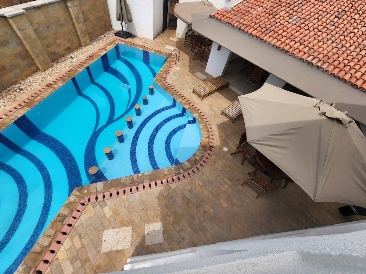 This Must Be The Place! Ranila Vibrant & Modern 3 bedroom fully furnished apartment with AC in all rooms, a swimming pool & fast Wi-fi. Ideal for FAMILY, FRIENDS, WORKMATES etc. It is clean, cosy, with an equipped kitchen, 50" smart TV, dining table, dedicated workspace, warm water showers and washine machine provided. Conveniently located a few minutes' walk to the beach & malls. It's perfect for business or leisure travellers, those on official duties or those who need a break at the coast