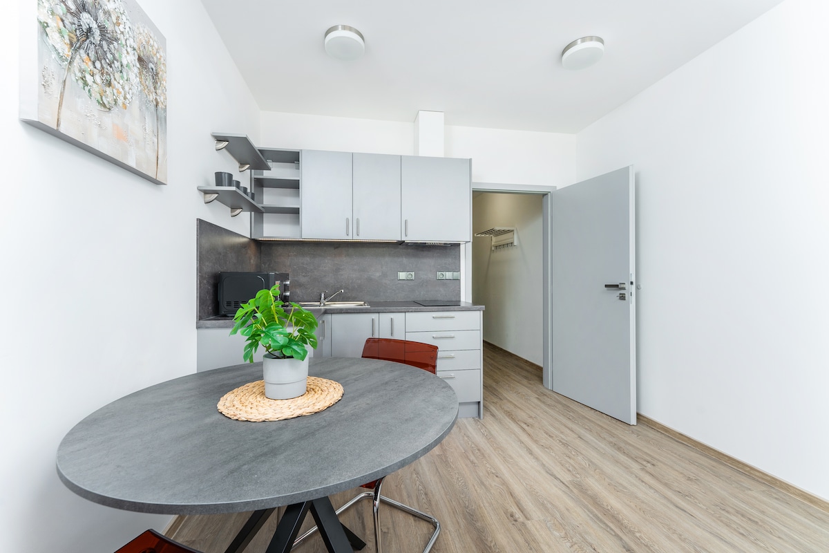 Utca: Čechova 114: 61-es számú lakás „Prága” 2+kk 54 m2 egy új épület legfelső emeletén, erkélyes. Zárt VIP szint chipemelővel, 100% -os biztonsággal, kiszolgálással és kényelemmel. Légkondicionálás, teljes felszerelés, beleértve az edényeket és törölközőket. 300 méterre a központtól - Poděbrady oszlopsor, 2 percre a vasút- és buszpályaudvartól - 55 percre Prága központjától. Internet 350 Mbit Up & Down korlátozás nélkül!!! WiFi teljes lefedettség. 4K 55''TV. Mosógép és szárítógép, mosogatógép, hűtőszekrény / fagyasztó, mikrohullámú sütő.