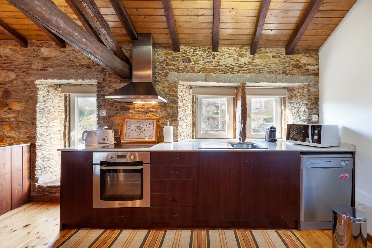 Gyönyörű, felújított kőház a tenger és a Mt. Ideális azok számára, akik szeretnék élvezni a vidéki galíciai nyugalmat, sétálni az elvarázsolt erdőkön vagy a Rias Baixas legjobb strandjain. Öt hálószobája van, mindegyikben saját fürdőszoba, egy nagy és otthonos nappali /étkező kandallóval, valamint egy könyvtár és egy játszótér a galériában. Teljesen felszerelt konyha mikrohullámú sütővel, Nespresso, mosogatógép. Gyönyörű, kilátással a kertre.