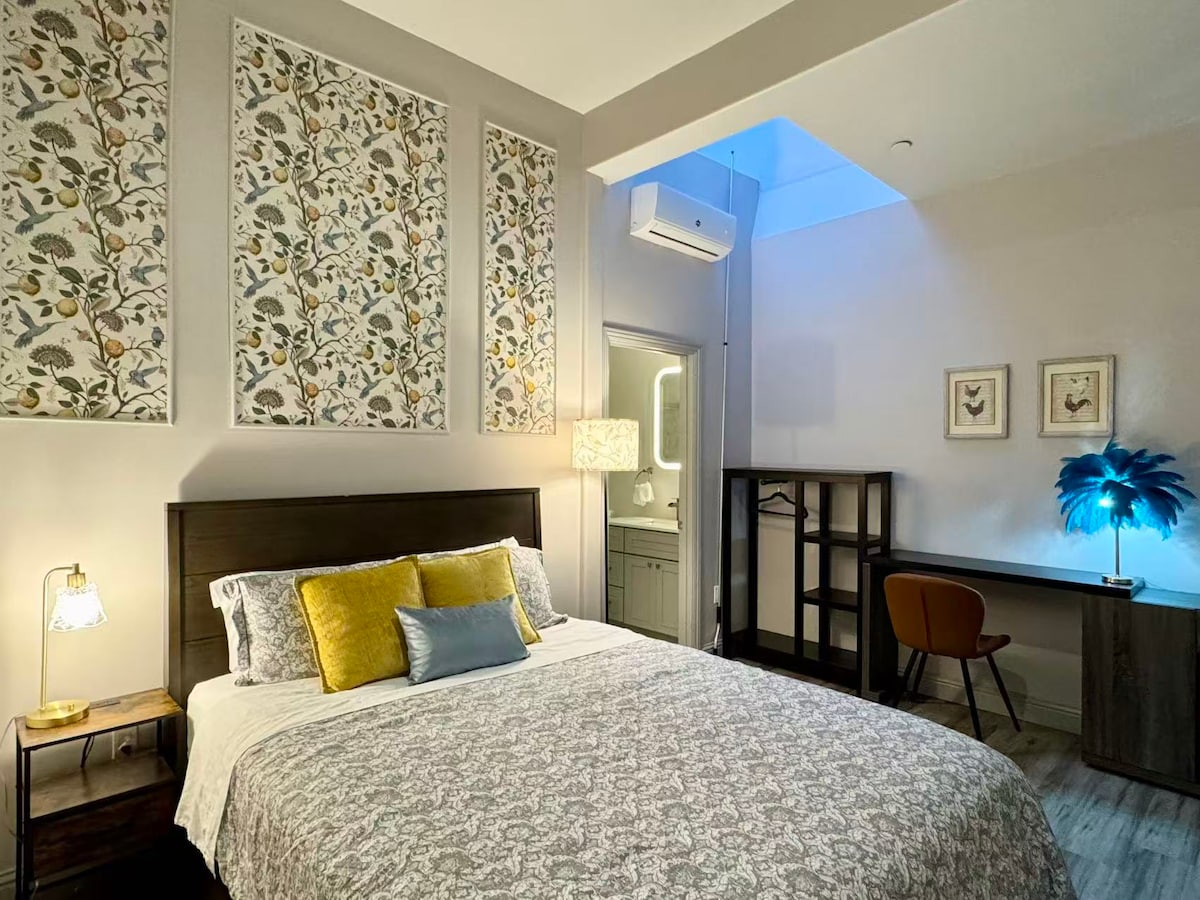 Ez a gyönyörűen berendezett szoba virágokkal teli udvarunkra nyílik, 🌸 és két extra hosszú franciaággyal rendelkezik 🛏️🛏️ (queen méretű hosszúságú). Egy kicsi, családi tulajdonban lévő motelben található a Marina Districtben, a 🏙️ Cow Hollow és a Chestnut Street üzleteinek és éttermeinek közelében. Élvezd a sétálható környéket és a meghitt szálláshelyet. 🚗 Ingyenes parkolás az elérhetőség függvényében - egyeztess a recepcióval. 🐾 Nem állatbarát. 👥 Maximális kihasználtság: 4 vendég. Már nagyon várjuk, hogy üdvözölhessünk! 😊