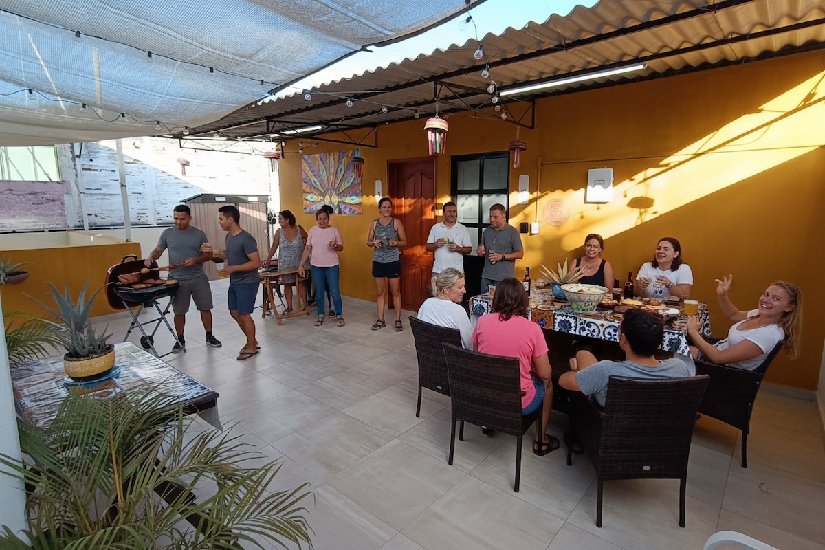 Terasz a belvárosban – teljes szállás 9 fő részére: 3 hálószoba, 4 ágy (3 matr + 1 king) és 2 fürdőszoba (exkluzív használat). 10 percre Santo Domingótól és ½ háztömbnyire a Sánchez Pascuas piactól. Konyha, terasz grillezővel, Wi-Fi [275] Mbps és parkoló (1 fedett hely). Sétálható hely: éttermek, piacok és kultúra gyalogosan. Élj át egy autentikus oaxacai élményt, amely tele van kényelemmel, és közel van a történelmi központ varázsához!