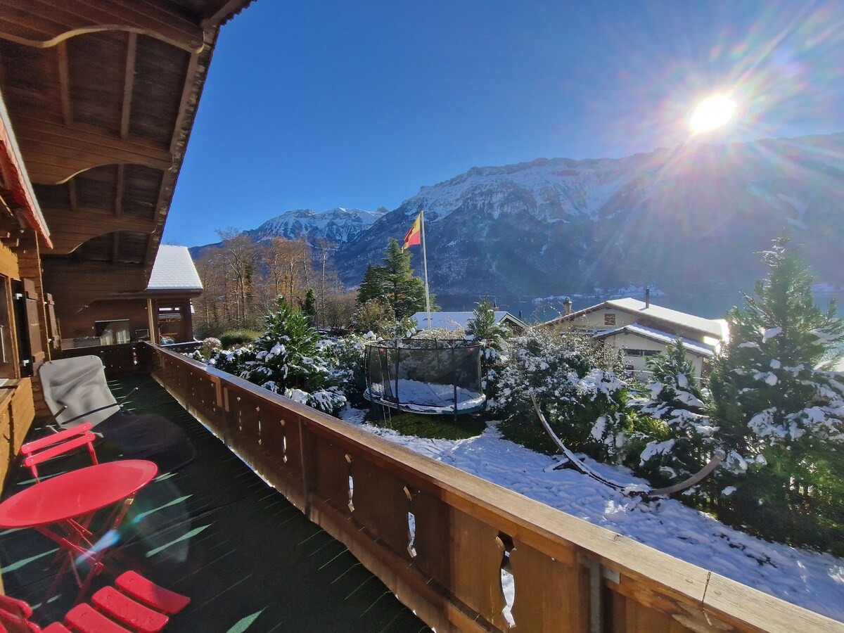 Hagyományos faházunk a Brienz-tó felett kissé magasabban fekvő déli lejtőn található. Az apartmanból élvezheti az egyedülálló, gyönyörű kilátás nyílik a zöld-kék Brienz-tó a környező hegyek! Az apartman az első emeleten található, és közvetlen hozzáféréssel rendelkezik a kerthez, terasszal +tóra/hegyekre néző kilátással Ez egy 3 perces sétára a tóparton. INGYENES PARKOLÁS közvetlenül a ház mellett. Számos sportolási lehetőség a közelben. A trambulin csak a vendégeinknek van. *Nagyon népszerű, mert otthonról dolgozik *