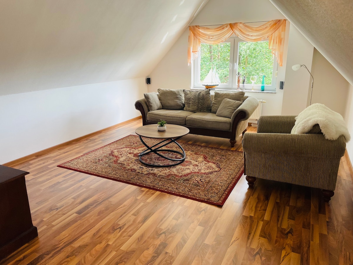 Gyönyörű és világos lakás közvetlenül az erdőben, nagyon jó kerékpárúttal a Lusatian Lake Districthez. A kb. 65 négyzetméteres lakás egy gyönyörű fürdőszobából és egy teljesen felszerelt konyhából áll. A hálószobában van egy kényelmes franciaágy, a nappaliban pedig a kanapé kihúzható két további alvóhelyre. A parkolás stresszmentes lehet az ingatlan előtt, mindenféle költség nélkül. Motorkerékpárok esetén a tető alatt is lehet parkolni az ingatlanon.
