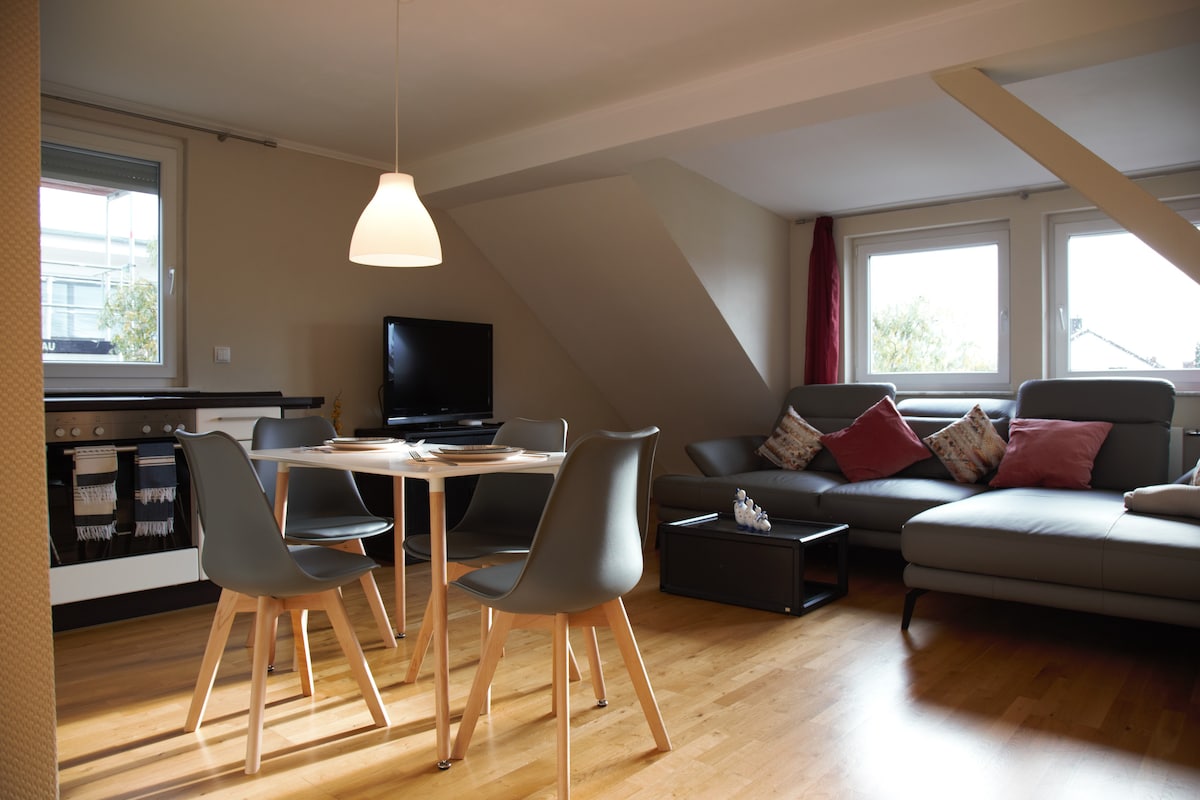 NEST NO.1 - a bright ambience in a clear feel-good design. On more than 110 sqm the guest can expect a spacious dining area, 2 cozy bedrooms with large double bed, a sunny kitchen, a daylight bathroom and a separate guest toilet. Our large living room invites you to linger on the large sofa. The terrace with a small garden offers additional space and in the evening you sit there and enjoy the last ray of sunshine and let the day end. Frankfurt airport: 28km, Frankfurt fair 37km.